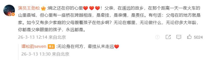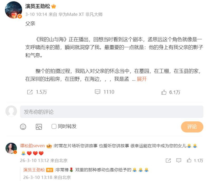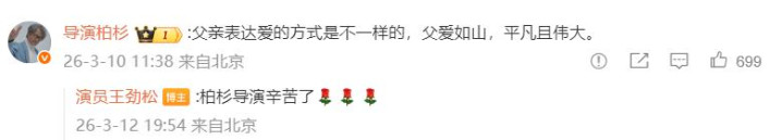 王劲松在几天前的微博发文解释我方对父亲这个脚色的深入感悟,从戏中谈到践诺生涯,共享东谈主生感悟,谭松韵也在微博下复兴“很运道能在戏中成为您的男儿”。