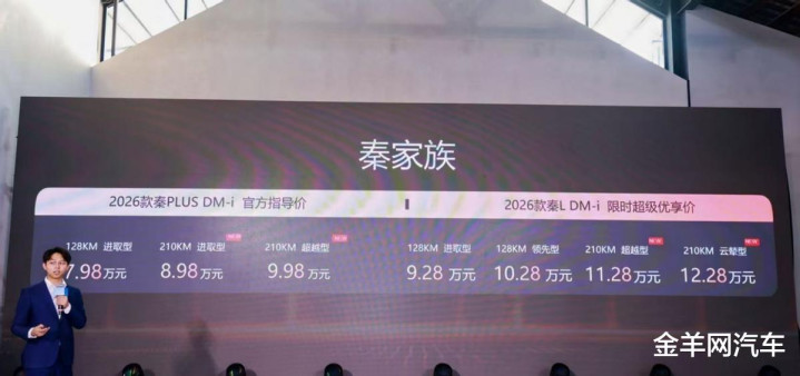其中,2026款秦L DM-i 210KM长续航版限时11.28万起售;2026款秦PLUS DM-i 210KM长续航版限时起售价8.98万元;2026款宋Pro DM-i长续航版限时11.98万元起售。