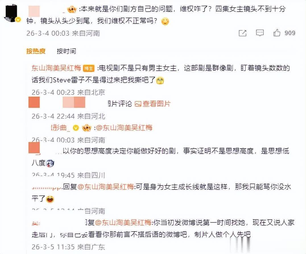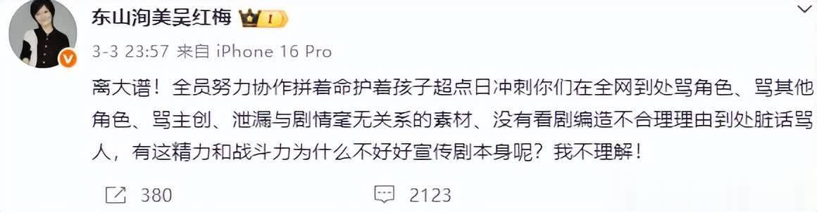 吴红梅也在前两天回话了这件事,称全组东说念主员都在护着这部剧,效劳粉丝却一直在骂主创和变装。