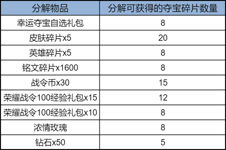 咱们可以看一下官方给出的数据,比如咱们抽到皮肤碎屑 5 个,那么明白就可以获取 20 个夺宝碎屑,在扫数奖励内部,皮肤碎屑明白的夺宝碎屑是最多的。