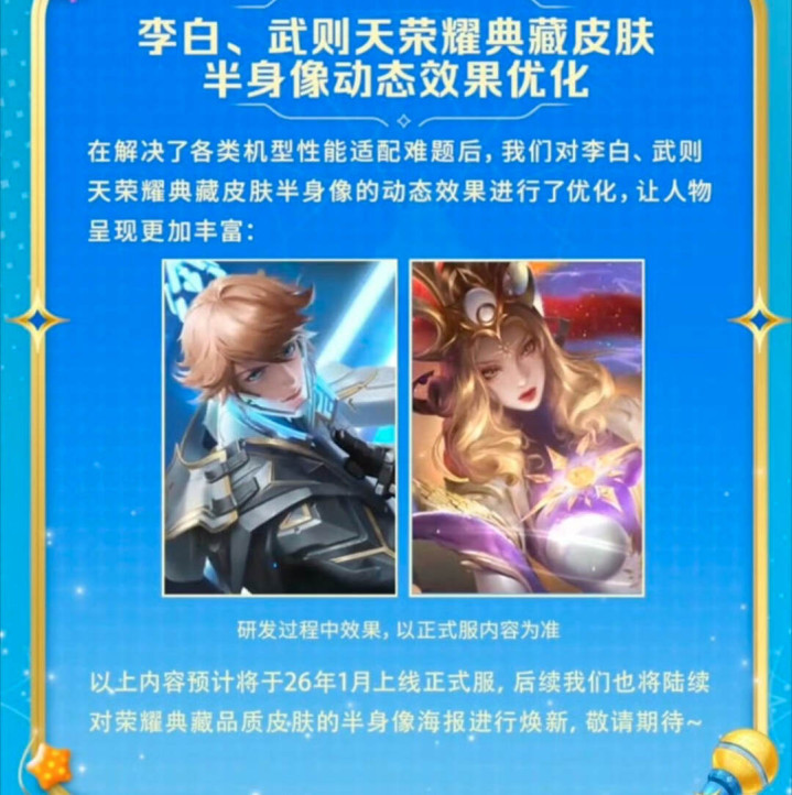 第一批上线的全新封面将会在 2026 年 1 月份上线认真服,其他的荣耀典藏皮肤海报也将会进行换新,合座来看,优化之后的还短长常可以的。