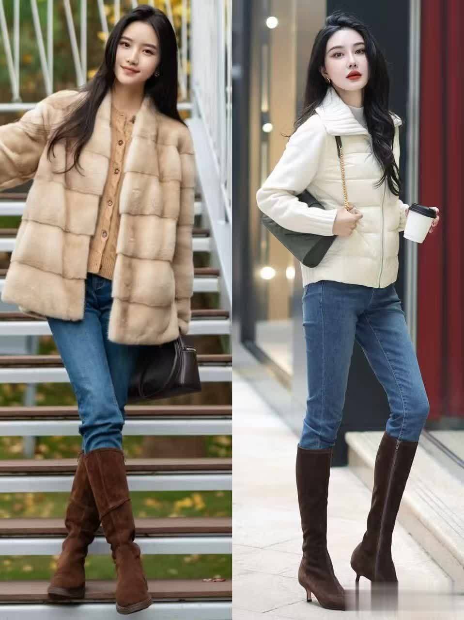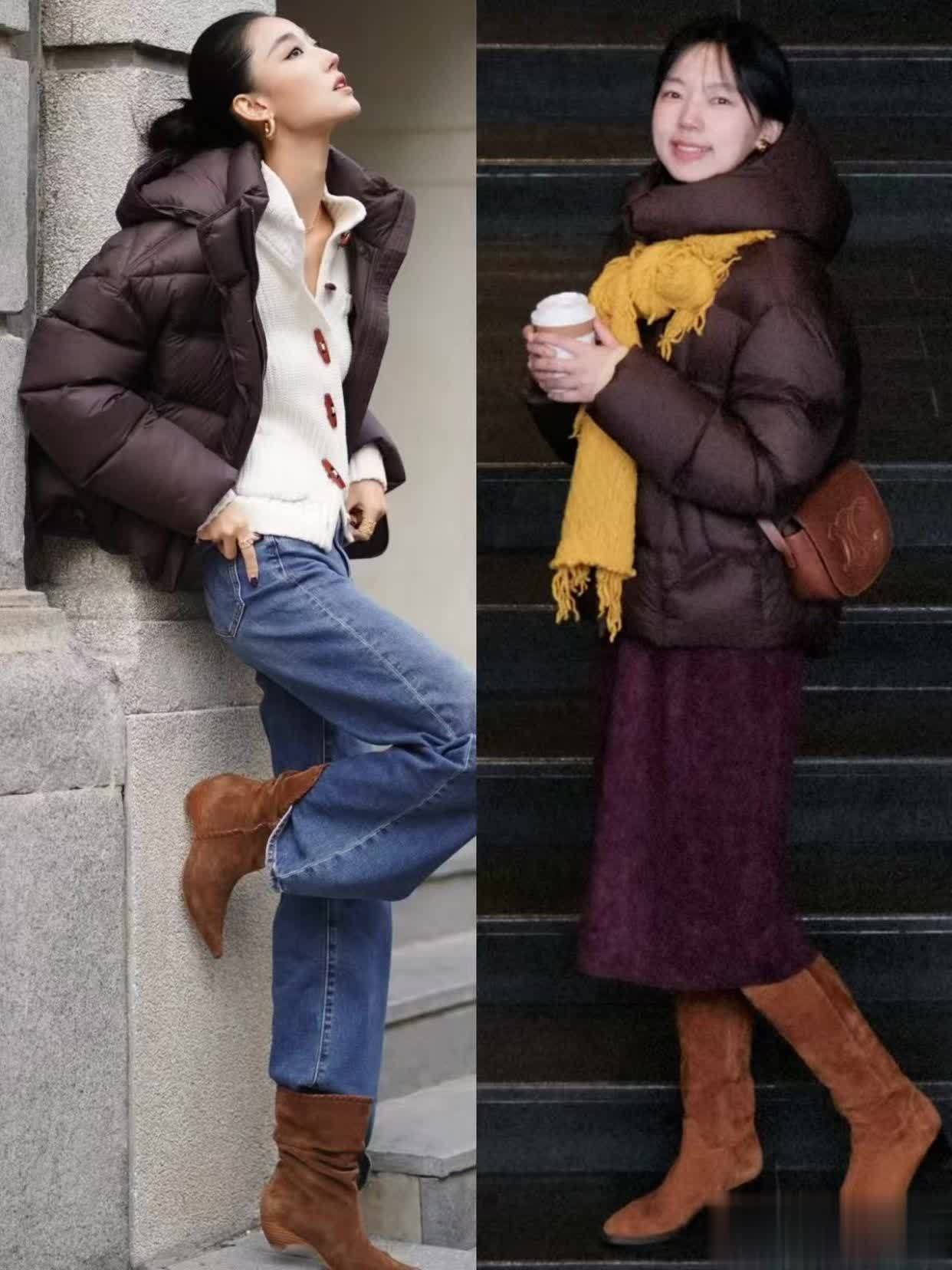 第二章:冬天这么穿麂皮靴,洋气又高档,阻隔粗拙感look1.羽绒服+麂皮靴