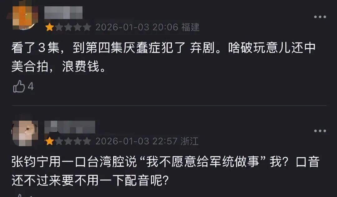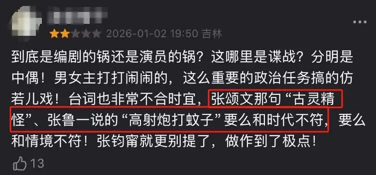 有不雅众吐槽:“听张钧甯言语,就像在喝奶茶,甜得发腻,和谍战剧的基调都备不搭。”