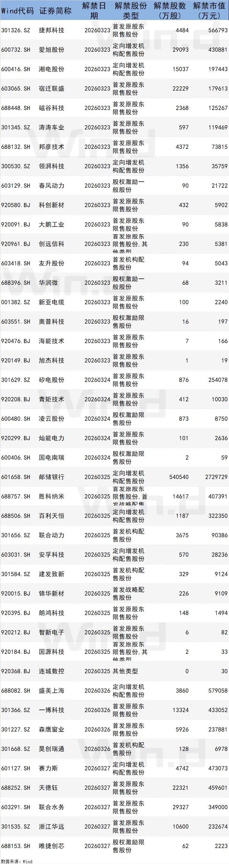从解禁市值来看,3月25日是解禁岑岭期,11家公司解禁市值所有359.79亿元,占下周解禁限制的42.7%。按3月20日收盘价计较,解禁市值居前三位的是:邮储银行(272.97亿元)、盛好意思上海(57.91亿元)、捷邦科技(56.68亿元)。从个股的解禁量看,解禁股数居前三位的是:邮储银行(54.05亿股)、磋磨水务(2.93亿股)、爱旭股份(2.91亿股)。